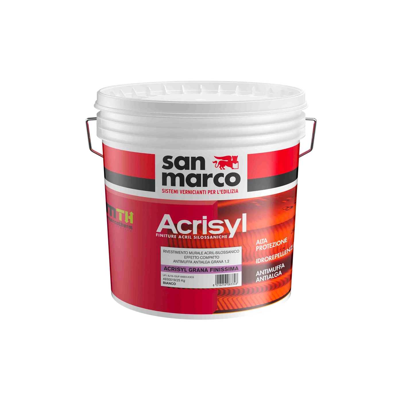 Το Acrisyl INTONACHINO GRANA FINISSIMA είναι παστώδης σοβάς για διαμόρφωση αδρής επιφάνειας εξωτερικής και εσωτερικής χρήσης, κατασκευασμένος με ακρυλικές-σιλοξανικές ρητίνες, με υψηλή υδροαποθητικότητα και εξαιρετική υδρατμοπερατότητα. Συμμετέχει ως σοβάς τελικής στρώσης στο πιστοποιημένο σύστημα εξωτερικής θερμομόνωσης Marcotherm. Καταργεί την ανάγκη βαφής, δημιουργώντας μία επίστρωση ανθεκτική στις καιρικές συνθήκες. Βελτιώνει και κρύβει τοιχόν αστοχίες ενώ παρουσιάζει μεγάλη αντοχή στις αλκαλικές επιφάνειες.